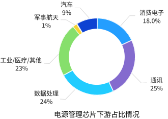 DCDC轉(zhuǎn)換器是電子設(shè)備中的關(guān)鍵器件,其性能優(yōu)劣對電子產(chǎn)品的性能和可靠性有著直接影響,是模擬芯片最大的細分市場之一,廣泛應(yīng)用于消費電子、通訊、數(shù)據(jù)處理、工業(yè)/醫(yī)療/其他、軍事/航天和汽車領(lǐng)域,其中通訊領(lǐng)域的應(yīng)用最多,為25%。
